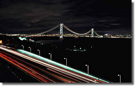 KOBE、明石の町の夜景をバックに光り輝く夕暮れどきなどは、多数のカップルが・・。ココ自動車道のサービスエリアには公園の様に明石海峡大橋を臨めるところも有り、何時間も居るひとも。毎分00分時には七色のレインボーカラーで橋が輝き、また月替わりでその月の誕生石色に輝いたり、特別