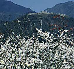 但馬の吉野と呼ばれる立雲(りつうん)峡は山桜の名所だ。しかしここのおもしろいのは遠望してみることを良しとするところだ。桜にはその木の下で酒を酌み交わしてめでる桜から、こうして遠くから見ると素晴らしいと言われるものまで、数多くの楽しみ方がある。そのことだけでも、いかに我々の祖先は自然を大切にしてきたことか、そしてその中でも桜の花を楽しみにしていたことかがうかがい知れる。 山城遺跡として全国でもまれな完存する遺構である竹田城址は観るべきものが多い。山城と言えば沖縄に残る今帰仁グスクも石垣の遺構が完全に残る素晴らしいものだ。今帰仁グスクには日本で最も早い寒緋桜と桃の花が咲く。この竹田城の天守台は標高353.7メートルの山頂に築かれている。竹田城は、嘉吉年間(1441〜43)、但馬の守護大名、山名宗全が出石城の出城として播磨・丹波から但馬への侵略路に位 置するこの地に、13か年を費やして築いたと伝えられている。現存の遺構は、1577(天正5)年の豊臣秀吉の但馬攻めの後、近世の城郭に普請するように命じたものとみられていて、別 名を“虎臥城”とも呼ばれ、国の史跡にも指定されている。その山城から遠見の桜として眺められていたのがここ立雲峡の山桜だ。 写真は逆に立雲峡から竹田城址を眺めたものだが、よくもまぁあんなところに城を築いたものだと思う。標高756メートルの朝来(あさご)山の中腹にある立雲峡は、点在する無数の奇岩・巨岩のなかを樹齢300年以上の山桜とソメイヨシノが咲き誇る。山間部を縫うように朝来山のふもとには円山川が沿って流れ、晩秋には円山川特有の川霧が出て幻想的でもあるこの地。山桜の間には中国山地特有のこぶしが点在するのもおもしろい。桜の山の中に入り込み遠く山城を見ていると下界の喧騒もわすれ、一瞬自分が山城の時代にタイムスリップしたような不思議な気持ちになる。 また和田山町には国の天然記念物の大木「大カツラ」がある。主幹は朽ち果てしまい残念ですが、周囲から約80本の“ひこばえ”が亡き主幹を守るかのような形で林立、主幹の跡は6畳間くらいの広さがあり大きなもの。 *このページの製作年は1996年、データ内容は当時のものです* |
